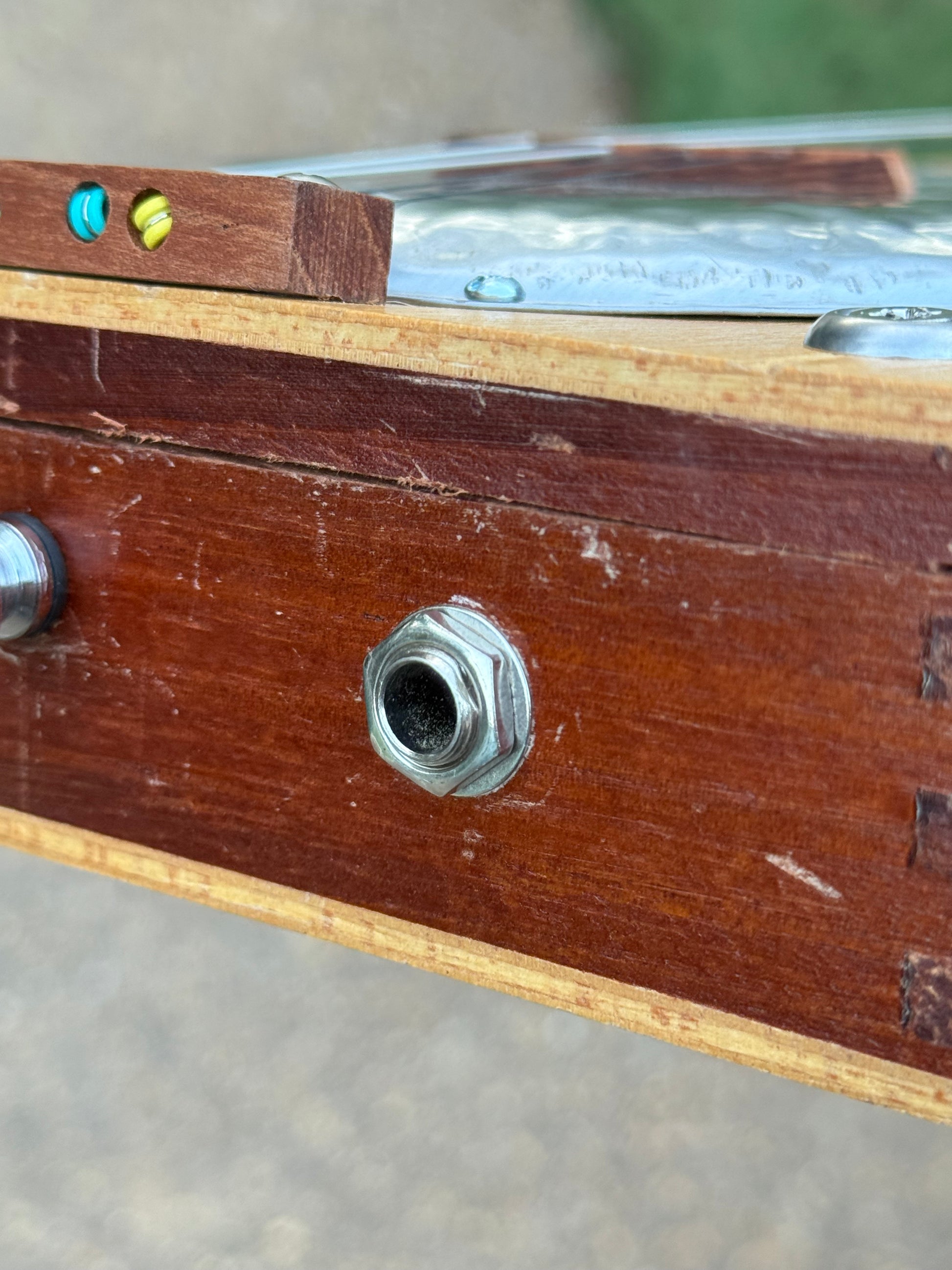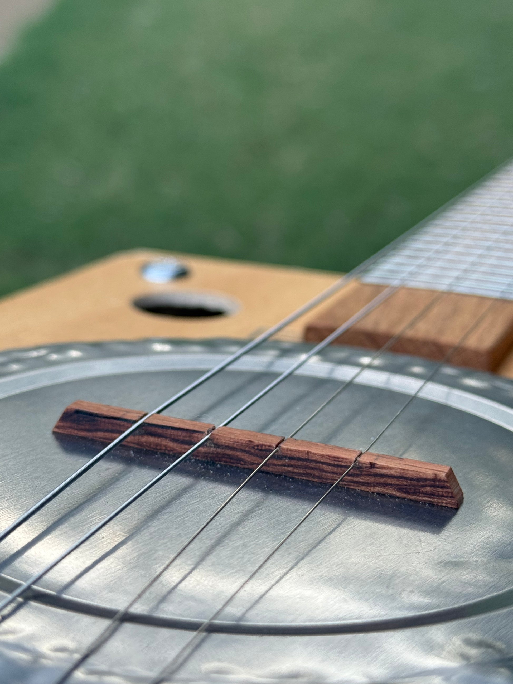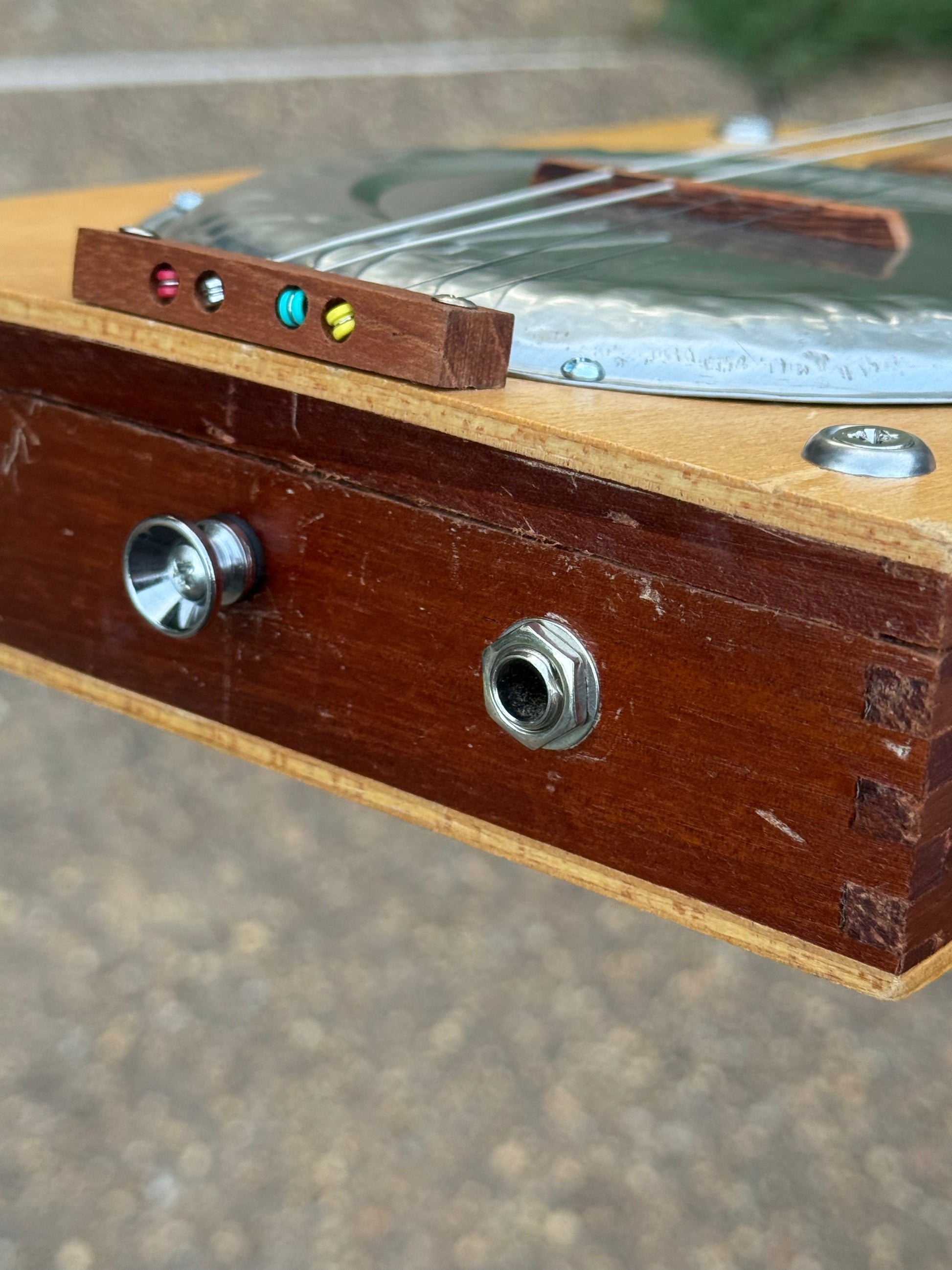 Features: Douglass fir neck, red oak fingerboard and headplate, bolt on neck, custom mahogany bridge and tailpiece, custom resonator made from paint can lid, custom piezo pickup, chrome geared tuners, bone nut, strap buttons.