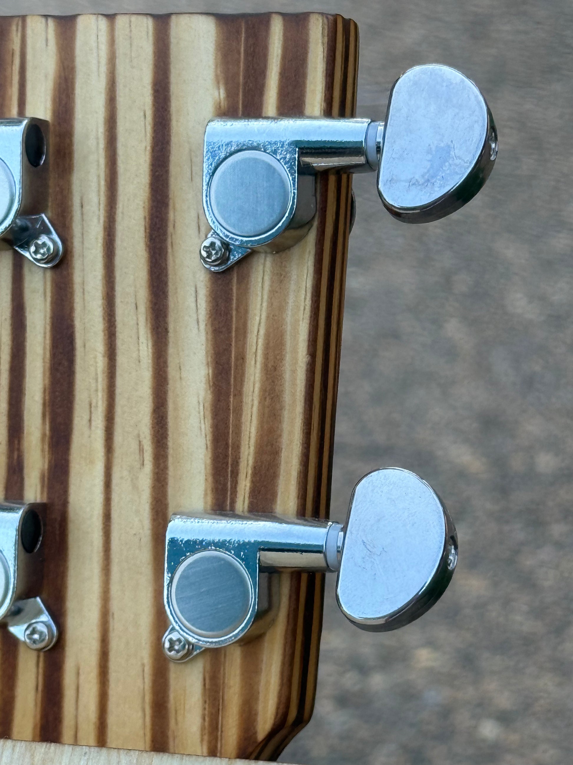 Features: custom charred pine neck, custom piezo pickup, chrome geared tuners, brass tailpiece, bone nut and bridge, steel strings